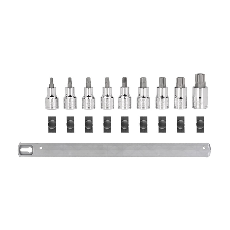 Strong, Precise Steel Bits - Made from heat-treated S2 steel for a hardened bit that holds fine geometry over time - The star-shaped bit has 6-lobes machined to precise tolerances for an exact, high-torque fit on Torx® fasteners that resists camming out ![]() Straight, Permanent Connection - Bits are pressed directly into the socket for a permanent connection - The carefully controlled process ensures bits are exceptionally straight - A tightly mated fit means bits will not loosen over time or under stress ![]() Large, Stamped Markings - Permanently impressed into the material by a roll-stamp die - As large as possible while still being readable along the socket's curved surface - Clearly visible size numbers with extra-deep outline ![]() Secure Drive Tool Engagement Detent grooves and beveled edges provide a smooth and secure connection with the drive tool. ![]() Portable Storage Rail Keep your sockets organized and ready to go using the included storage rail. The twist-to-lock clips hold sockets securely and can be repositioned anywhere along the rail. ![]() |