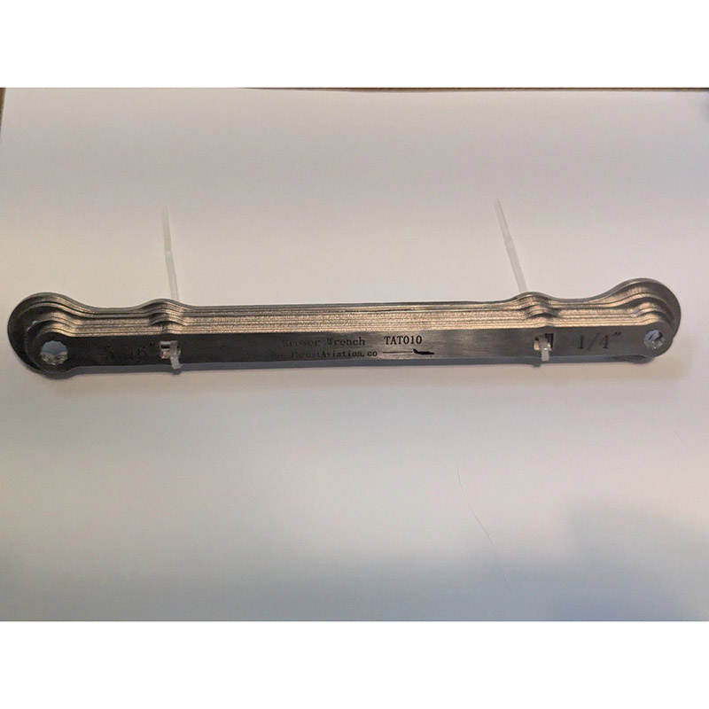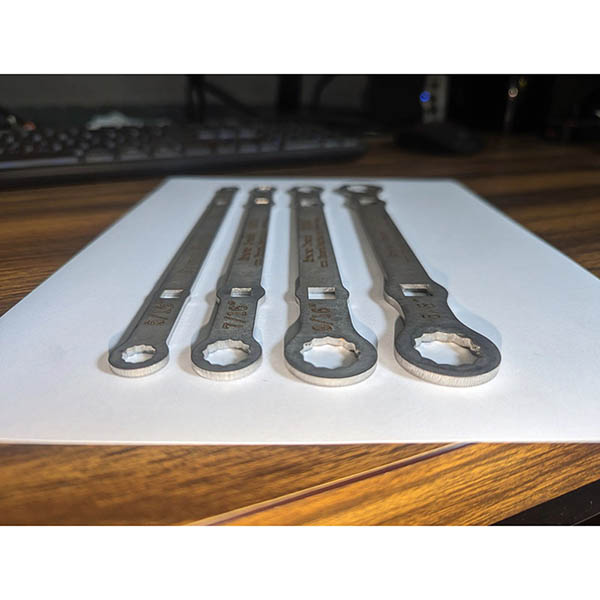 This set contains all four stainless thin wrenches, from 1/4" to 11/16". 12 point box ends, with 1/4" or 3/8" drives at 2 locations for torquing. Drives are 1.5" and 6.5" from fastener center. Laser cut from 10 and 12 gauge polished stainless steel. MADE IN USA. |