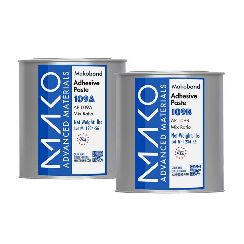 Makobond Adhesive Paste 109 provides excellent adhesion to a wide variety of materials such as aluminum, steel, brass, concrete, brick, glass, stone, ceramics, tile, and wood. AP-109 boasts exceptional handling properties with a 1:1 mix ratio by weight or volume, allowing for easy measuring. With a creamy, smooth viscosity, it is very easy to mix; and has good thixotropy for application to contoured or vertical surfaces without sag or runoff. AP-109 cures relatively quickly, developing sufficient handling strength in only a few hours. The cured material has excellent strength and good resistance to weak acids, moisture, and weather. Fully cured parts exhibit a service temp of up to 150˘XF (66˘XC). |