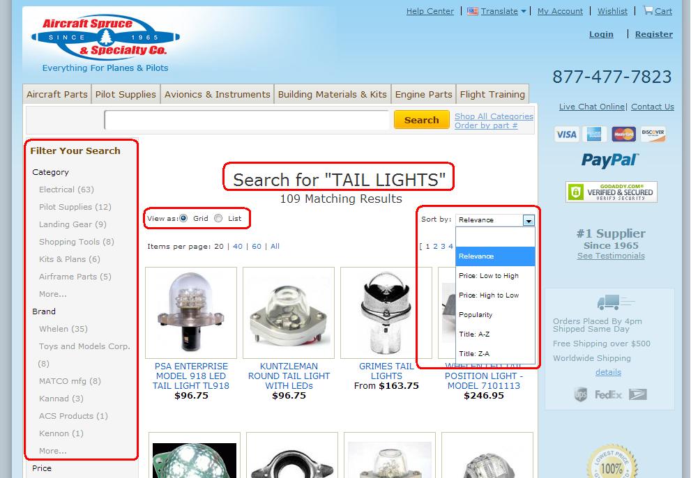 The quickest way to find what you need is to use our search feature. The search bar is prominently placed at the top center of every page. You can search using a number of terms, keywords, part numbers, or any combination. If by chance your search does not yield results, our new platform will serve recommended alternate searches that might lead you in the right direction. Another added feature of the search program is the ability to narrow your search by different variables. For example, the search below is for "tail lights". It will serve all matching results for that term, which is pretty broad. However, if I know I am looking for an actual tail light for my aircraft, I can filter the results by Category, which would be electrical. After that if I knew I wanted a Whelen tail light, I could sort those results by brand, and so on. This will give you that ability to narrow down your search results and hopefully guide you to the exact product you are looking for. Another new feature is the ability to sort the results by Relevance to the search term, Price, and Popularity. You can also adjust the way you view results, which is either in a 4 x 5 "Grid" or linear "List". You can see all of these areas highlighted in the screen shot below.