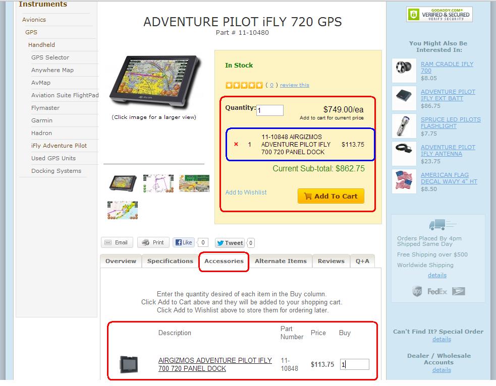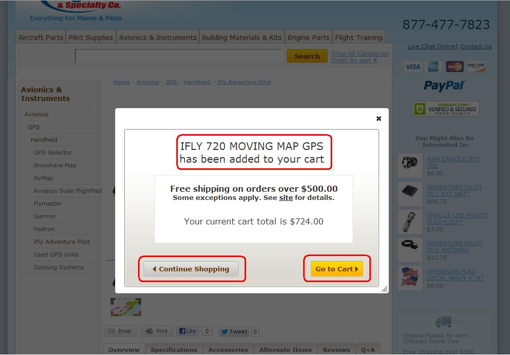 The simplest of pages is the single part page. The Add to Cart button here will move the quantity you choose into your shopping cart to order now and the add to wishlist button will save the item for ordering later. Once the item is added to your cart, a notification will popup explaining this. From here you can either continue shopping which will bring you back to the same page, or go to your cart to checkout. The tabs below the "Add to Cart" block and the photos are where the information is stored. You can cycle through these to view descriptions, features, specs, etc. The accessories tab will function differently than the old website. To order accessories, simply enter the number you want in the input box. You will see them added above in the "Add to Cart" block. Once you have the right accessories, click "add to cart" or "add to wishlist" and they will be added. There are two entirely new tabs on the site. They are "Reviews" and "Q+A". The reviews will allow you as a user to submit your feedback on the product. First rate the product on a 1 to 5 scale and then you can write in what you liked or disliked about the product. After we evaluate your review for explicit and/or false content, we will approve it and it will be posted for other users to use in decision making. The next one is "Q+A". You can use this tab to ask our product support specialists questions about the product. Once we find the suitable answer, you will receive an email and the question and answer will be posted to the website to assist future customers. Stock status is available on the product page as well as "Also Bought" items on the right side of the screen. These items are related products that previous customers have purchased with the item. See the screen shots below for examples.
