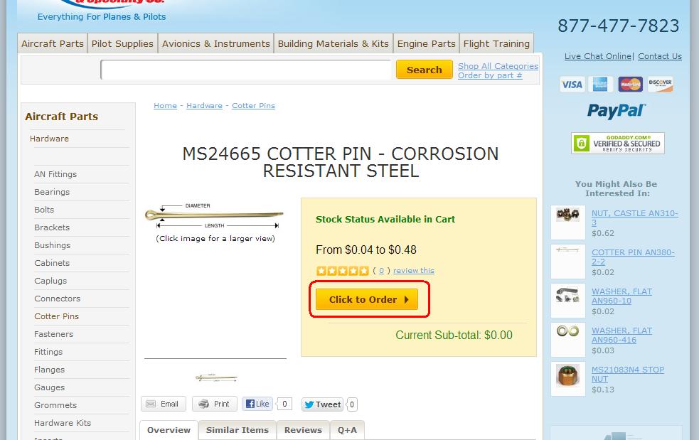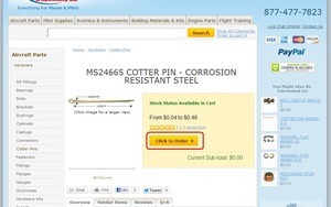 We have added the ability to checkout using Paypal. At the shopping cart screen, just click the checkout with Paypal button and you will be redirected to the Paypal website where you can make your payment. You will then be returned to the Aircraft Spruce website to complete your order. |