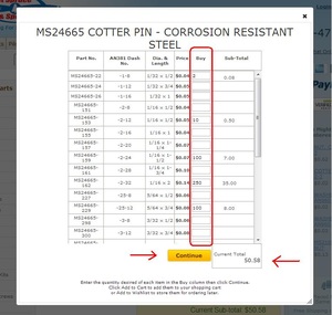 The last type of product page is the multiple part grid style page. This type of page is used when there is a large number of parts on one page that need to listed by description, specifications, sizes, etc. Examples of these would be hardware, metal, wood, engine parts, etc. The tab structure of information will be the same as the other pages. The difference here is to order, you first click the "Click to Order" button. This will pop up the window in which the parts will be listed. Type in the quantities you desire in the input boxes, usually found under the "Buy" column of the chart. Once you have made all your selections, click continue and you will see a temporary cart built with the products you selected. Once you have confirmed these are correct, click "Add to Cart" to move them to your shopping cart, or click "Add to Wishlist" to save them for ordering later. See the example below for all three steps illustrated.
