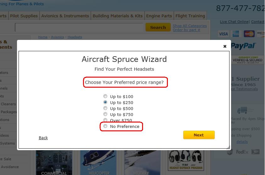 Another new feature that we have added is the Product Wizard. The idea is to help guide you into the correct products by asking you a series of questions. We will use the headset wizard as our example. The first question asked will be which brands of headsets you are interested in. If you are unsure, simply click the "Select All" link. Next, you will be asked to about what your spending limit is. These are listed in an "Up to" format, e.g. "Up to $200", "Up to $500", etc. If you are unsure, just click "No Preference". After that we will ask questions about the product. These will vary wizard by wizard. In the headset example you will be asked if you want passive or active and what plug type you will use. Keep in mind that you can always click "Select All" if you are unsure and if there aren't any matches for the selections you've made, those options will be made unavailable. Once you have gone through all the questions, your results will be presented for you to shop and make a choice. If you would like to start over, you can always click the "modify selections" link at the top of the results. We are hoping to build out our index of product wizards so that we can help you shop in a variety of categories. For a listing of our current product wizards, click here.