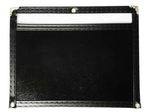 4-7/8" x 6-7/8" Black License Holder with clear plastic window to display ownership certificates. This also features tipped corners and mounting eyelets.