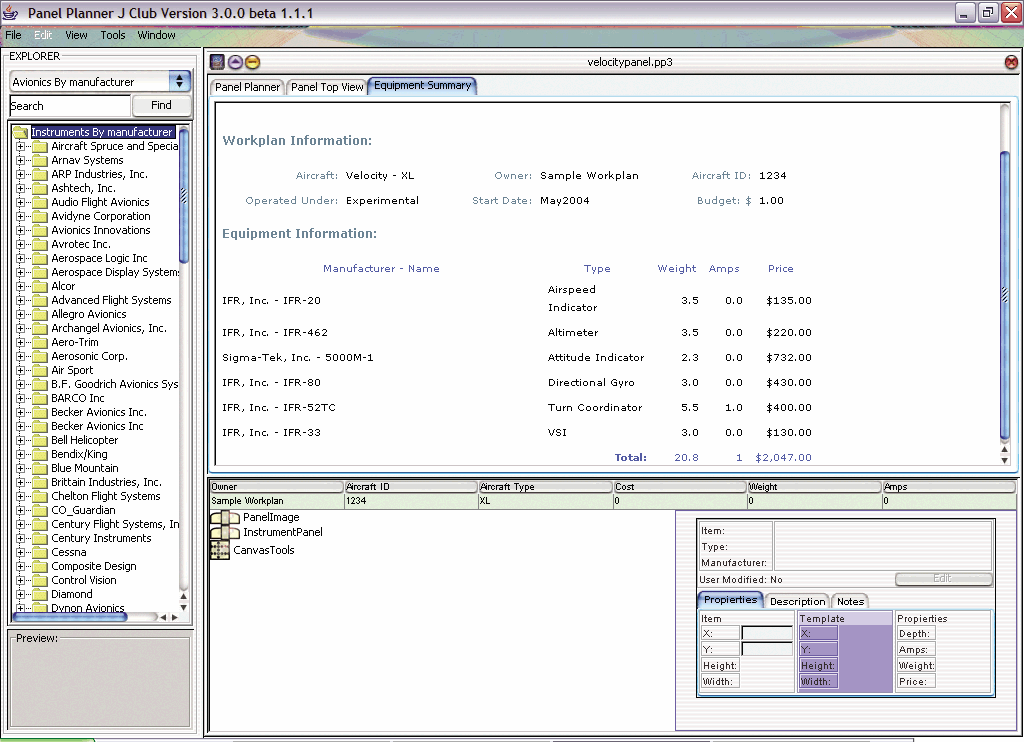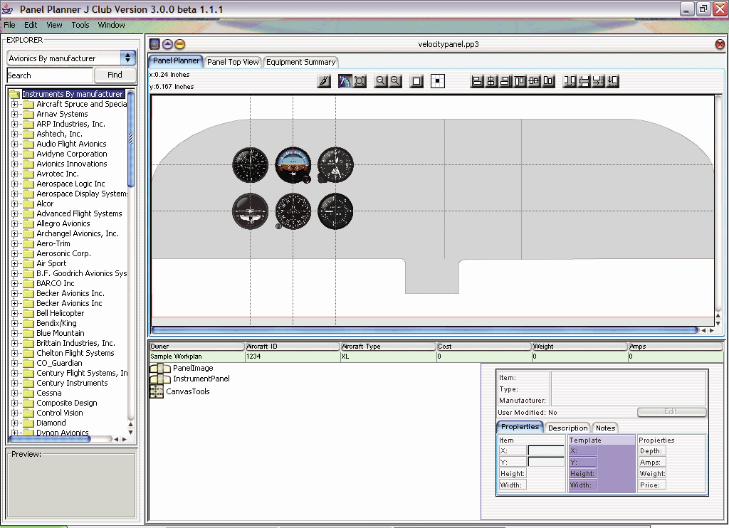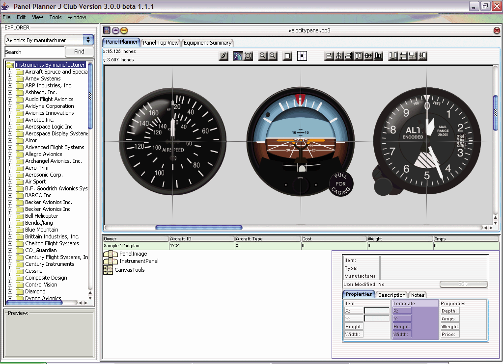 Panel Planner is your best solution for designing and fabricating whole instrument panels for large twin to experimental aircraft. It is made for the aircraft owner, homebuilder, repair/refit station, flight department, designer, or manufacturer. Panel Planner is a stand-alone program and no CAD experience is required! Panel Planner gives you the power to design and build instrument panels in record time. Simply drag full-color, photo-realistic instruments, avionics, and cockpit controls into place on an aircraft panel template. Today match your design to on-line data from Aircraft Spruce ®. Panel Planner tracks total cost, total weight, and peak current, generates an equipment list, and even prints actual-size hole-cutting templates and color mock-ups with your desktop printer. Cut panel design and construction by 50% or more! Panel Planner equipment and panels can be updated locally or over the internet keeping you up-to-date, with the most recent instruments in the market, ready for you to use. The software is multi-platform, based in a technology called Java, and can run either on Macintosh or Windows. Version 4.0 is now available in PC or Mac. Note: Limited to 5 panel designs per software. |